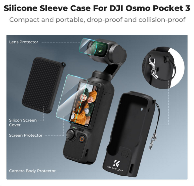 K&F CONCEPT Pocket 3 komplet silikonskih zaštitnih navlaka dizajniran je za optimalnu zaštitu i funkcionalnost, a sadrži izdržljivu silikonsku navlaku za tijelo, zaštitu od kaljenog stakla otpornu na eksploziju i praktične značajke protiv gubitka za dodatnu opremu vaše kamere.