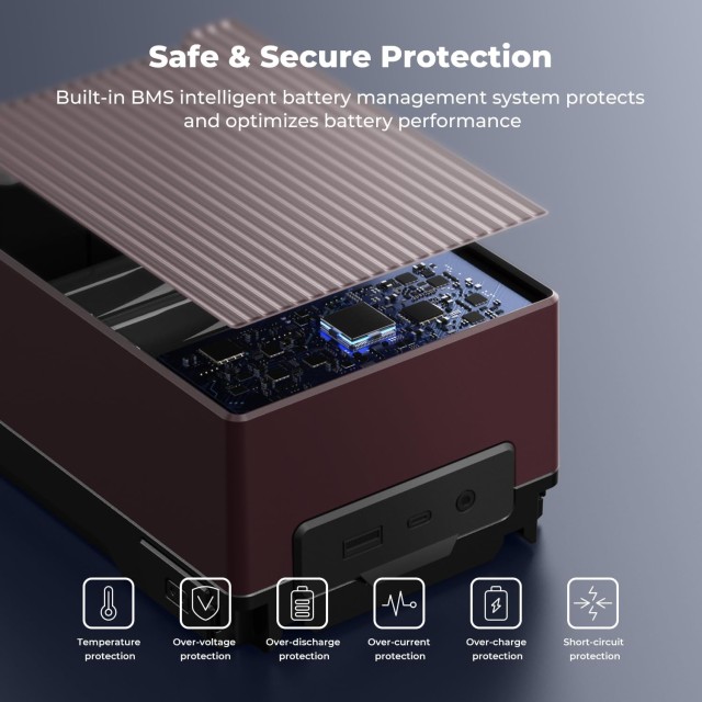 Sigurno i pouzdano: V Mount baterija koristi visokokvalitetne baterijske ćelije poznatih marki, a inteligentni BMS sustav pruža višestruku zaštitu, uključujući zaštitu od prekomjerne struje, kratkog spoja, previsoke temperature i prenapona.