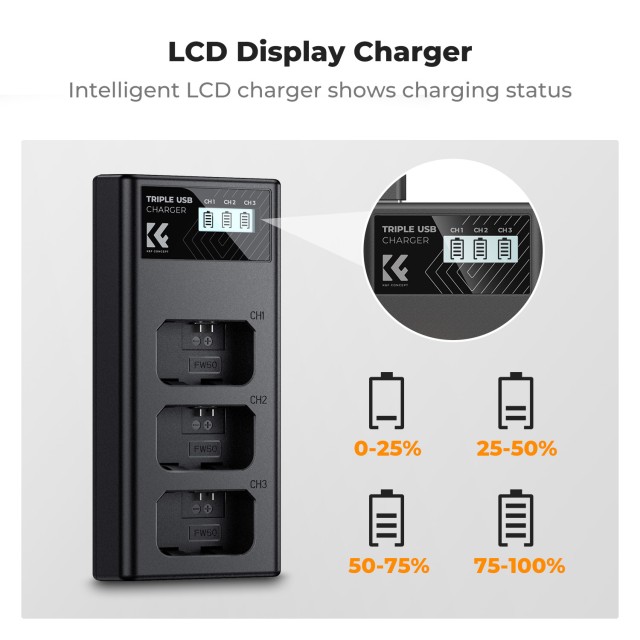 Bilo da bilježite trenutke u studiju ili na pustolovini na otvorenom, K&F Concept punjač osigurava da vaše baterije ostanu napunjene i spremne za upotrebu.