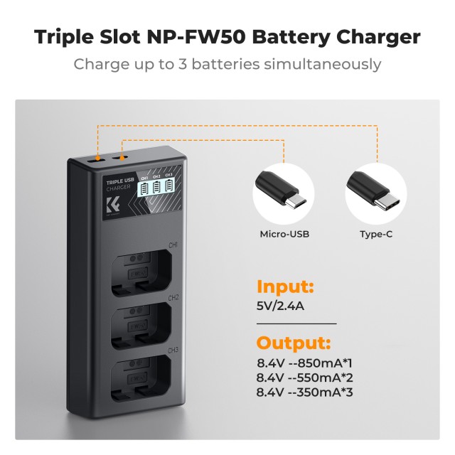 Bez napora napajajte svoje Sony NP-FW50 baterije pomoću K&F Concept 3-Pack punjača za fotoaparate. S punjenjem u tri utora, inteligentnim LCD zaslonom i raznovrsnim opcijama punjenja putem USB-a ili Type-C, ovaj punjač osigurava da su vaše baterije uvijek spremne za akciju.