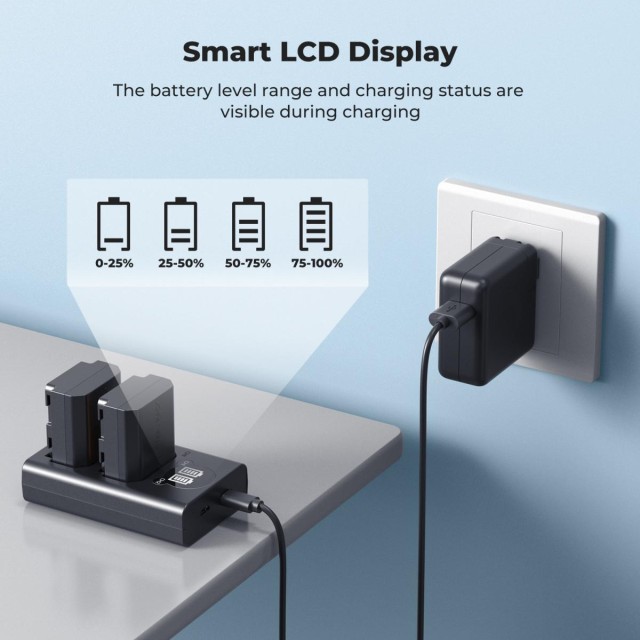 U kompletu se nalazi LCD punjač s dva utora , koji može istovremeno puniti dvije NP-FZ100 baterije. LCD zaslon prikazuje status punjenja u stvarnom vremenu za svaku bateriju, što olakšava praćenje napunjenosti.