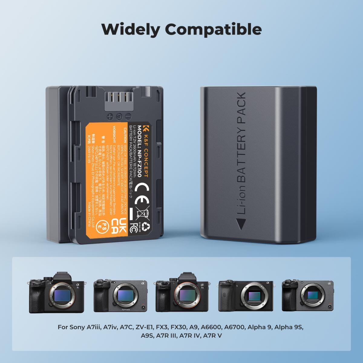 K&F Concept Sony NP-FZ100 baterijski komplet sadrži dvije baterije velikog kapaciteta od 2600 mAh , pružajući produljenu snagu za neprekidno snimanje. Dizajnirane za profesionalne i entuzijastične fotografe, ove su baterije potpuno kompatibilne sa Sony A7III, A7IV, A7C, ZV-E1, FX3, FX30, A9, A6600, A6700, Alpha 9/9S, A7R III/IV/V fotoaparatima, pružajući pouzdane performanse s potpunim dekodiranjem baterije.