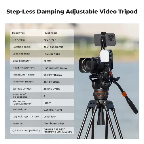 Njegove podesive noge u 3 dijela i srednji rasipnik pružaju poboljšanu stabilnost na neravnom terenu, dok mehanizam za zaključavanje omogućuje brzo podešavanje visine. Podržava opterećenja do 8 kg , kompatibilan je s DSLR-ima, fotoaparatima bez zrcala, kamerama, pa čak i kino opremama. U srcu ovog sustava je fluidna glava BV10 s beskonačno podesivim hidrauličkim prigušenjem . To omogućuje nevjerojatno glatke i dosljedne pokrete kamere, bez obzira izvodite li kontrolirane panoramske pokrete (360° horizontalna rotacija) ili precizne nagibe (+90°/-75° vertikalno podešavanje). Postignite profesionalne, glatke snimke koje će vaš video učiniti zaista posebnim.