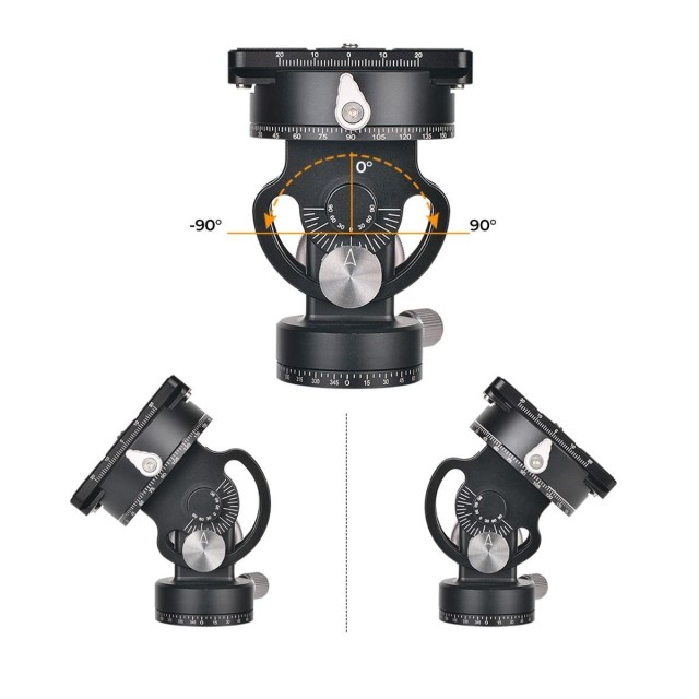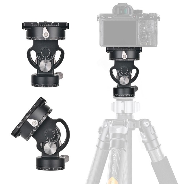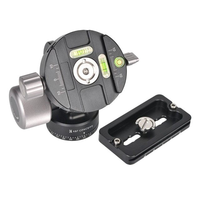 K&F Concept VH-60L Kuglasta glava stativa s dvostrukim panoramskim dizajnom od aluminijske legure. Ploča za brzo otpuštanje usvaja standard Acra i može se instalirati s kardanima drugih marki. Sučelje vijka na vrhu je 1/4-inčni odvojivi vijak, koji može biti praktičniji za ugradnju kamere