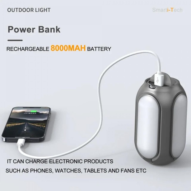* Može se koristiti kao mobilni izvor napajanja: ovo svjetlo za kampiranje ima ugrađenu bateriju velikog kapaciteta od 8000 mAh i USB DC 5 V 2 A izlazni priključak za brzo punjenje vašeg mobilnog telefona, iPhonea, tableta i drugih uređaja putem USB kabela za punjenje tijekom planinarenja ili kampiranje.
