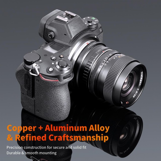 Adapter za objektive K&F Concept Contax Yashica na Nikon Z nudi fotografima mogućnost montaže klasičnih objektiva Contax Zeiss C/Y na moderne Nikon Z-serije fotoaparate bez zrcala. Precizno izrađen od izdržljivog bakra, adapter omogućuje glatko, sigurno i pouzdano prianjanje uz održavanje odgovarajuće udaljenosti prirubnice za beskonačno fokusiranje. S jasno označenom crvenom točkom za poravnanje, instalacija i uklanjanje su jednostavne i intuitivne.