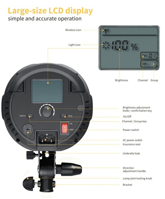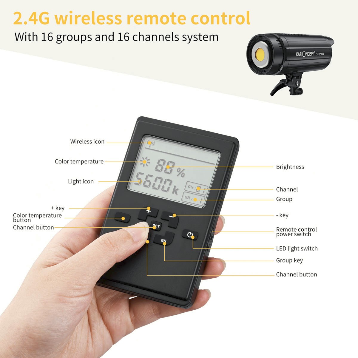 S CRI od 95 i TLCI od 95+, ST-150W osigurava prirodne tonove kože i točnu reprodukciju boja. Svjetlina se može glatko podesiti od 10% do 100% pomoću stražnjeg regulatora jačine svjetla ili priloženog bežičnog daljinskog upravljača. Veliki, jasni LCD zaslon prikazuje postotak svjetline, kanal i postavke grupe, omogućujući istovremeno grupiranje i upravljanje više svjetala.