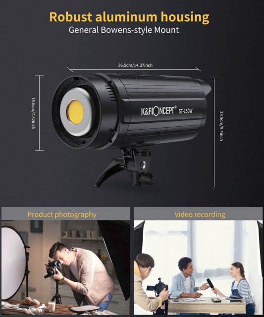Izrađeno s čvrstim kućištem od aluminijske legure, svjetlo ima učinkovit sustav odvođenja topline s vrhunskim hladnjakom i ultra tihim ventilatorom za hlađenje, osiguravajući dugotrajnu stabilnost bez ometanja snimanja zvuka. Popularni Bowens nosač pruža široku kompatibilnost sa softboxovima i modifikatorima, dok uključeni reflektor i utor za kišobran omogućuju fleksibilno oblikovanje svjetla. Zahvaljujući svojoj robusnoj konstrukciji, mogućnosti daljinskog upravljanja i univerzalnom nosaču za stalak, K&F ST-150W je pouzdan alat za rasvjetu za studijsku i fizičku upotrebu.