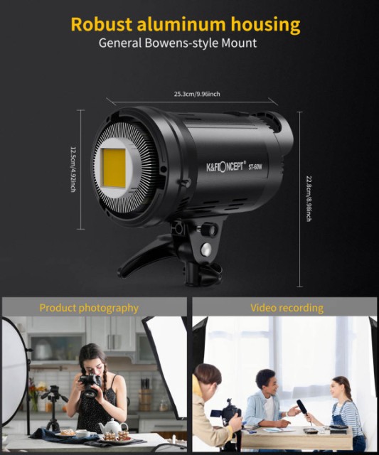 K&F ST-60W kontinuirano LED stalno svjetlo je kompaktno, lagano dnevno COB LED svjetlo dizajnirano za intervjue, vlogove i fotografiju. Nudeći točnu reprodukciju boja, kompatibilnost s Bowens nosačem i bežični daljinski upravljač, pruža profesionalne performanse osvjetljenja u vrlo prenosivom obliku.