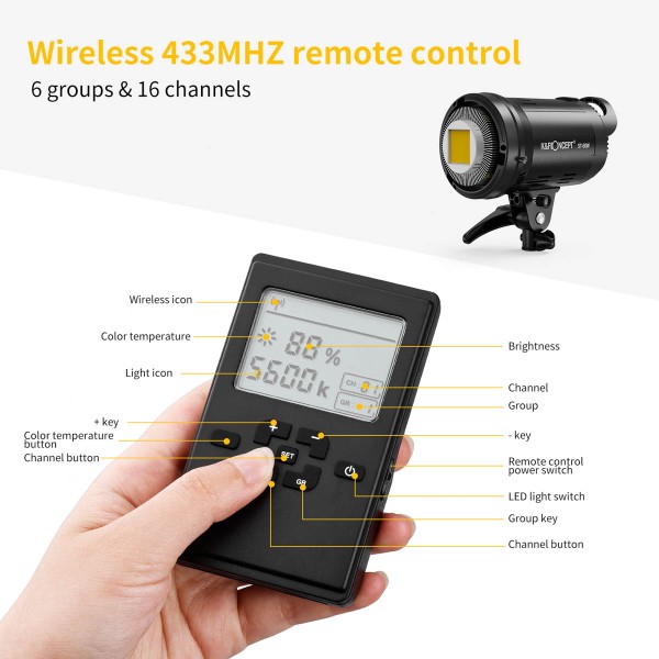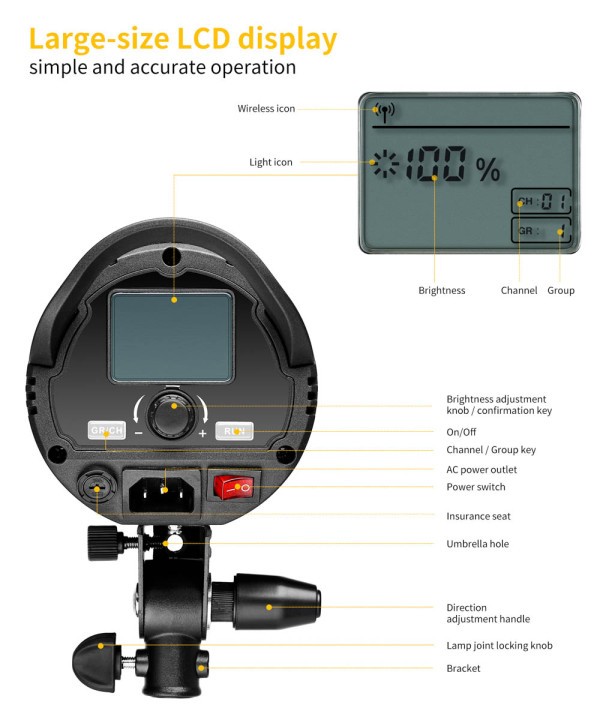 Svjetlina se može glatko podesiti od 10% do 100% pomoću ugrađenog prigušivača ili priloženog bežičnog daljinskog upravljača. Jasan stražnji LCD zaslon prikazuje postotak svjetline, kanal i informacije o grupi, omogućujući istovremeno grupiranje i upravljanje više svjetala. Bowens dizajn nosača podržava širok raspon softboxova i modifikatora, dok priloženi reflektor i utor za kišobran pružaju fleksibilne mogućnosti oblikovanja svjetla.