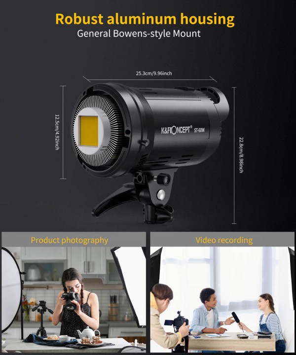 Smješten u izdržljivom kućištu od aluminijske legure, ST-60W ima učinkovit sustav odvođenja topline s tihim ventilatorom za hlađenje, što ga čini prikladnim za okruženja osjetljiva na buku. Njegova kompaktna veličina, lagana konstrukcija i pouzdane performanse čine ga izvrsnim izborom za kreativce kojima je potrebna profesionalna rasvjeta u pokretu.