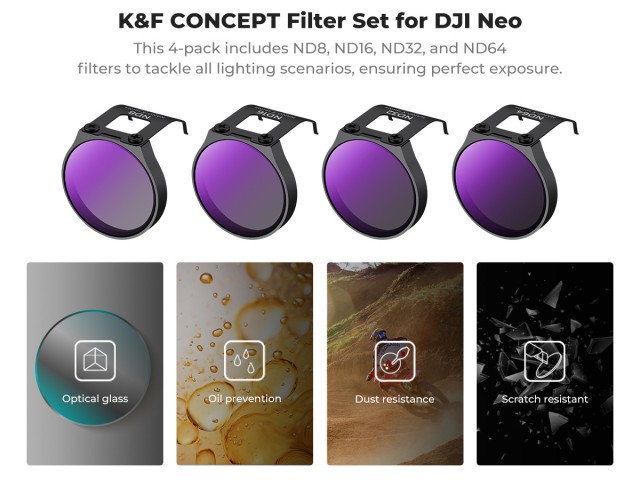 Komplet filtara K&F DJI NEO od 4 komada pruža osnovne ND i polarizirajuće filtre za poboljšanje ekspozicije, smanjenje odsjaja i poboljšanje boje za DJI NEO fotografiju dronom, s izdržljivim, vodootpornim dizajnom otpornim na ogrebotine za visokokvalitetnu sliku u svim uvjetima.