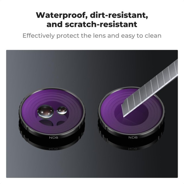 K&F ND8 filtar za DJI Osmo Action 5 Pro & Osmo Action 4 pruža smanjenje svjetlosti od 3 koraka , idealno za djelomično oblačno vrijeme . Sadrži AGC optičko staklo s 28 višeslojnih premaza , smanjuje odsjaj, refleksiju i vodene mrlje, a istovremeno osigurava realistične boje i jasnoću slike . Lagani dizajn s uvrtanjem osigurava sigurno prianjanje bez utjecaja na stabilnost fotoaparata.