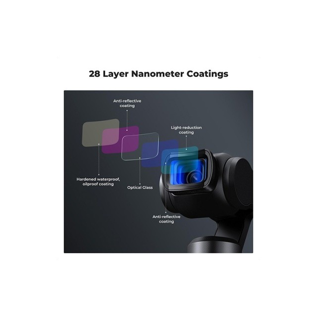 - 28 višeslojnih premaza: usvojeni višeslojni premaz koji pomaže u odbijanju vode, prašine, masnoće i protiv ogrebotina. Jednostavan za čišćenje i održavanje te štiti vaš Osmo Pocket 3 objektiv od svih strana. Crno obojeno prilagođeno površini okvira filtra kako bi se smanjila refleksija i smanjio utjecaj na sliku.