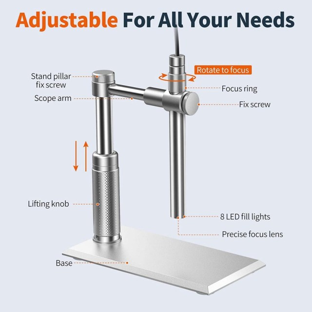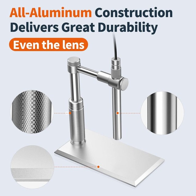 * Potpuno aluminijski materijal, čvrst i izdržljiv: ovaj USB mikroskop izrađen je od baze, postolja i leće od aluminijske legure, koji se mogu koristiti dulje vrijeme i mogu se mikrolemiti ili popravljati tiskane ploče;