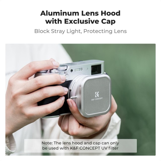 Kompatibilan s Fujifilm fotoaparatima X100/X100F/X100S/X100T/X100V/X100VI. UV filter je izrađen od uvoznog AGC optičkog stakla, s propusnošću svjetlosti do 99,6% s 28 slojeva dvostranog vodootpornog i otpornog na ogrebotine premaza. Može smanjiti ultraljubičasto svjetlo i pomoći u uklanjanju plavkastog odsjaja na slikama. Štiti objektiv od prašine, prljavštine i ogrebotina.