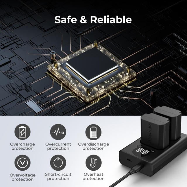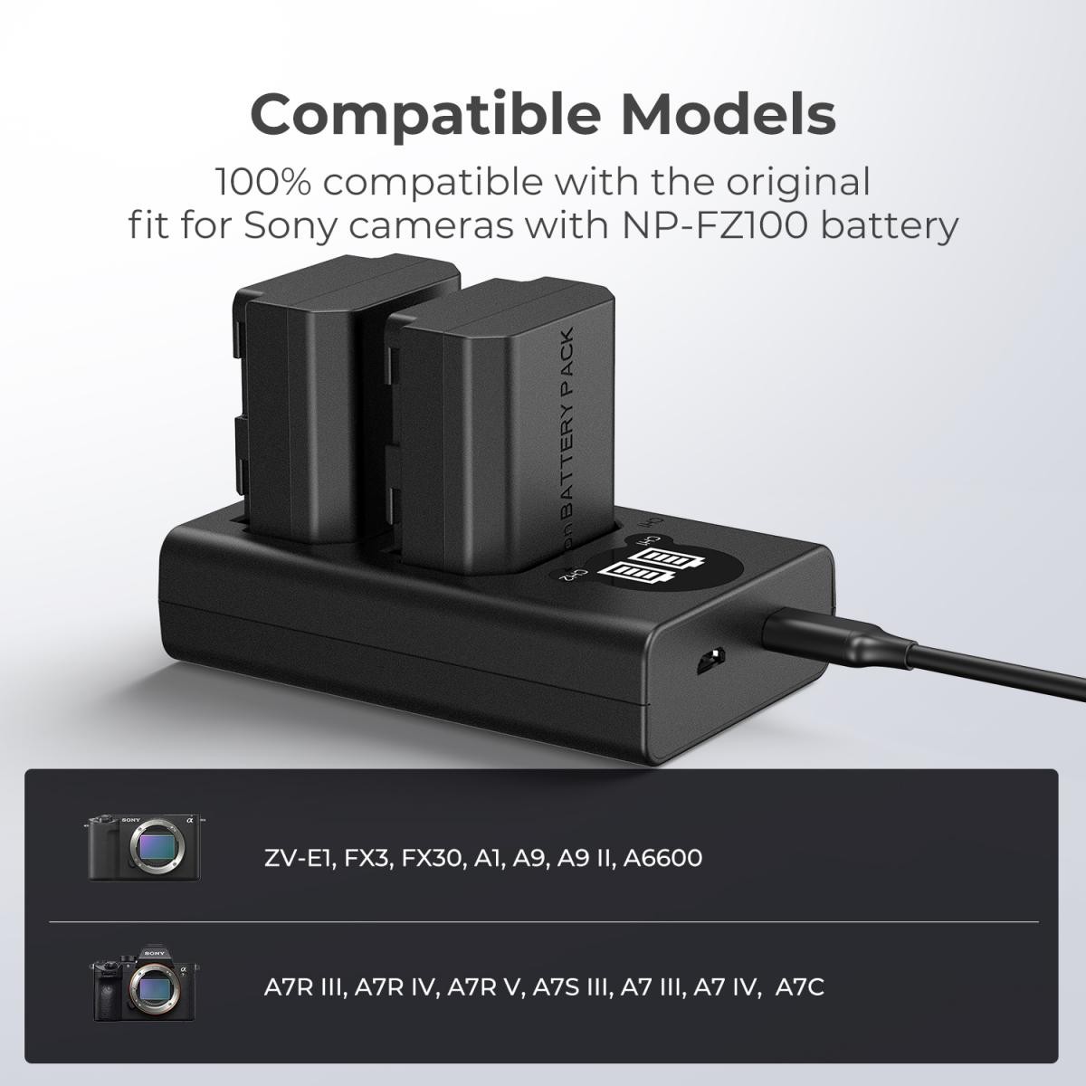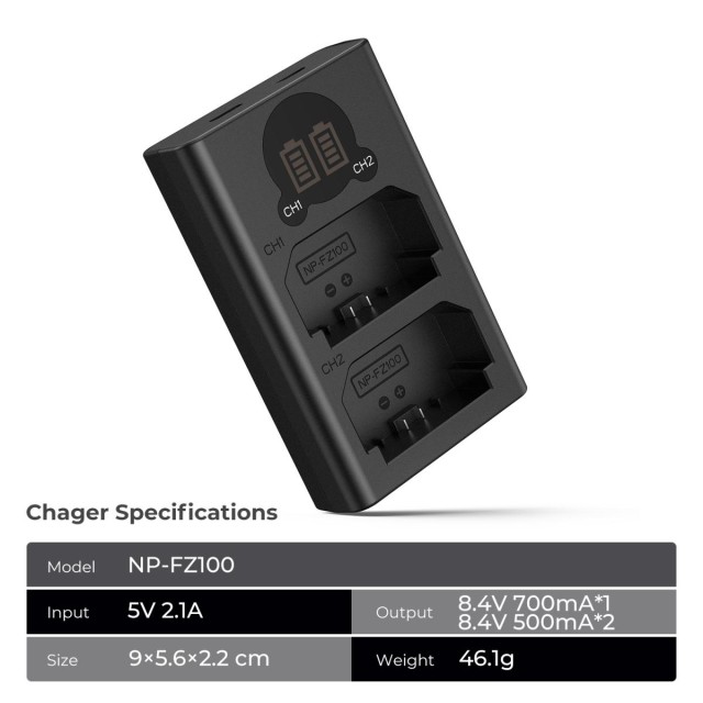 Učinkovito napunite svoje Sony NP-FZ100 baterije pomoću K &F FZ100 dvokanalnog punjača . S dvostrukim priključcima za punjenje i svestranim USB-C/Micro USB ulazom, ovaj punjač može istovremeno napajati dvije baterije, a istovremeno inteligentno štiti od prekomjernog punjenja, prekomjerne struje i pregrijavanja.