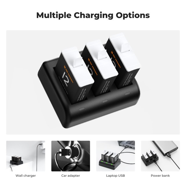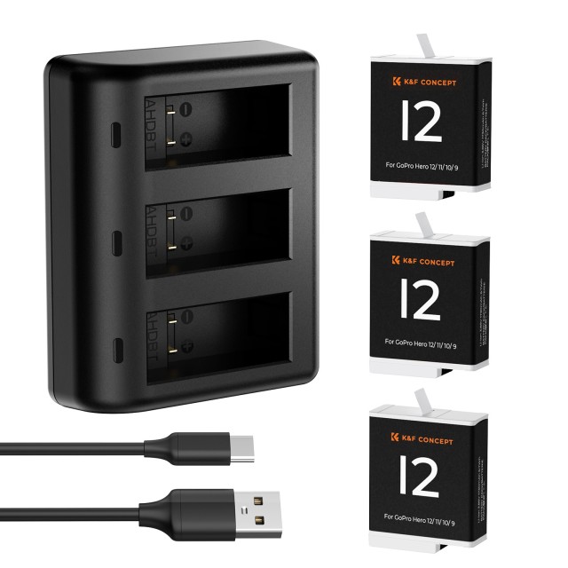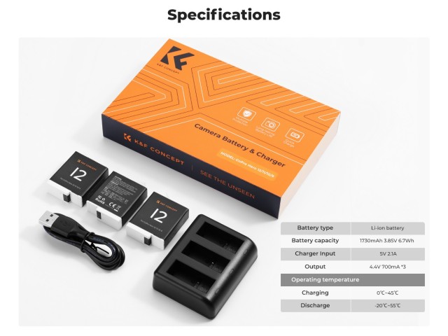 K&F Concept Hero 12 baterija 3 paketa enduro baterija od 1730 mAh s punjačem s 3 utora kompatibilan s GoPro Hero 12, GoPro Hero 11, GoPro Hero 10, GoPro Hero 9 Black Camera. Izvorni standard. 3-paket enduro baterija od 1730 mAh usvojio je visokokvalitetnu baterijsku ćeliju, koristeći originalni standard, nazivni napon 3,85 V, 1730 mAh, stvarni kapacitet, bez efekta memorije baterije.