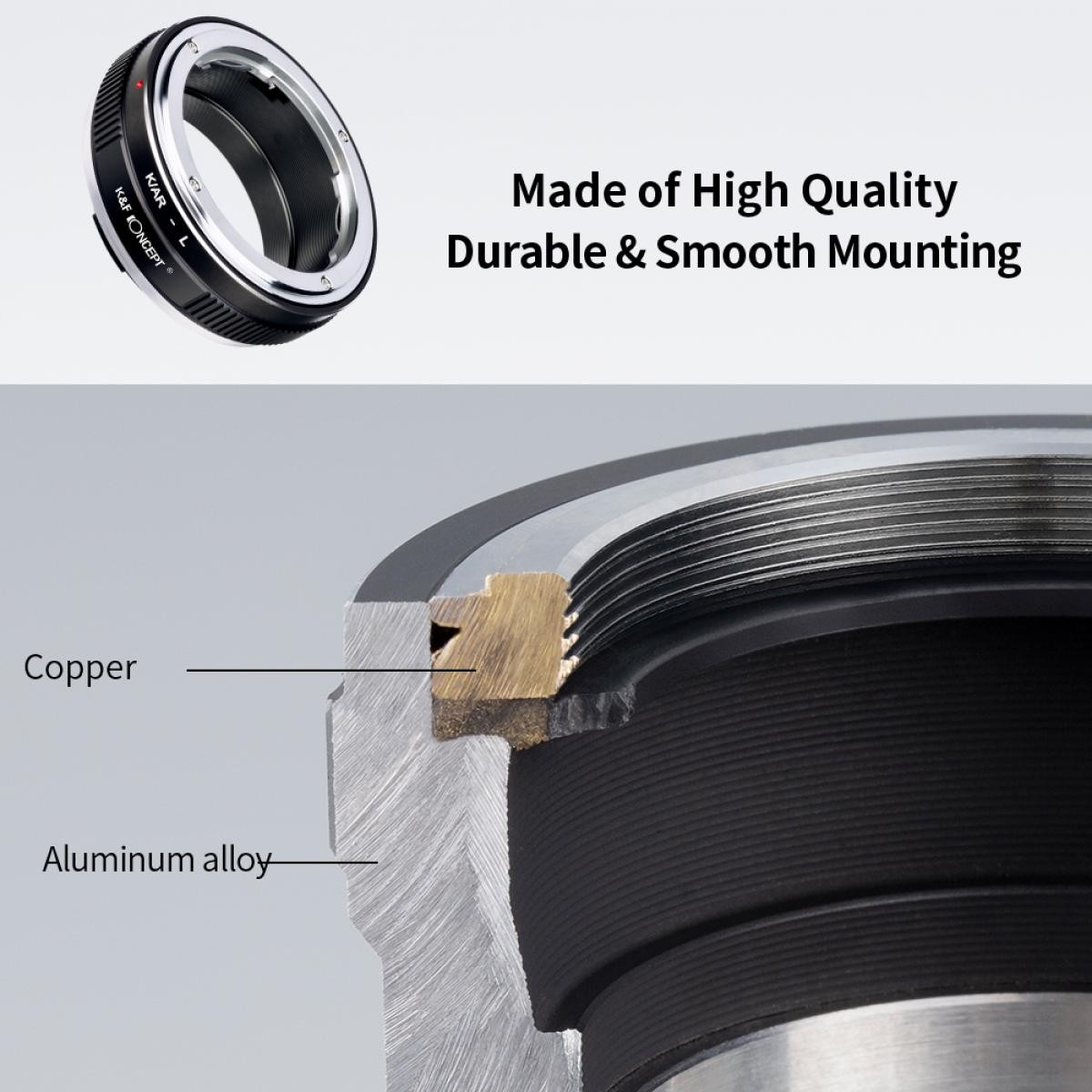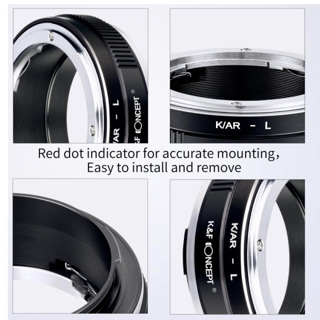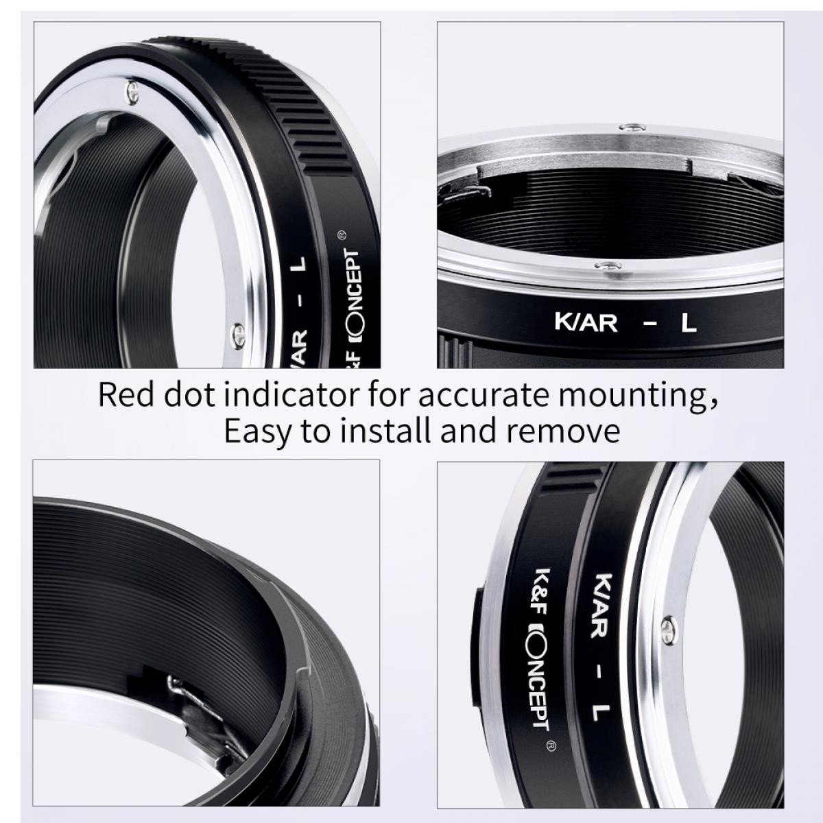 K&F adapter za visokoprecizne objektive K/AR-L omogućuje korištenje Konica AR objektiva s bajonetom na Leica L-bajonetu. Izrađen od legure bakra i aluminija, nudi glatku montažu, ručno upravljanje otvorom blende putem integriranog prstena otvora blende i podršku za beskonačno fokusiranje.