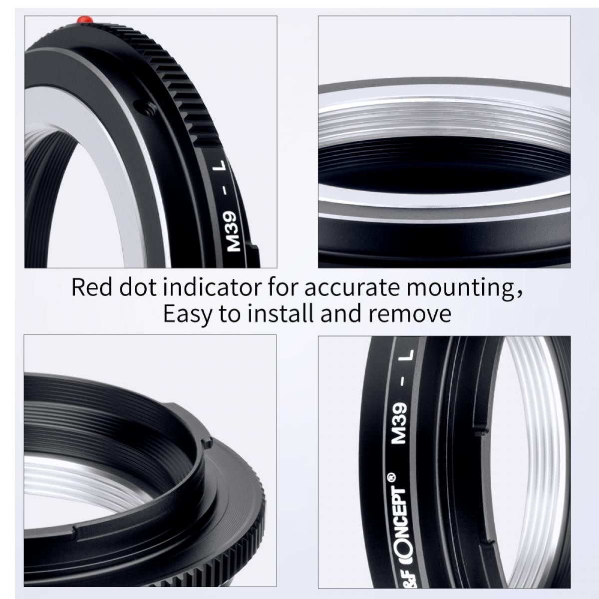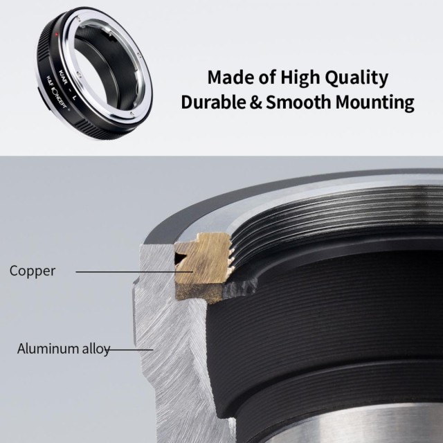 K&F adapter za objektive visoke preciznosti s M39 na L-mount omogućuje korištenje objektiva Leica M39 na L-mount fotoaparatima bez zrcala. Izrađen od visokokvalitetne legure bakra i aluminija, odlikuje se preciznim poravnanjem, glatkom montažom, potpuno ručnim upravljanjem i podesivim prstenom za otvor blende.