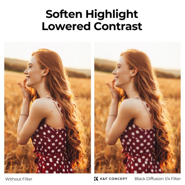 K&F SNJ51T 100×100×2mm Square Black Mist 1/4 filter set dizajniran je za stvaranje mekog, filmskog efekta u fotografiji i video produkciji. Ovaj crni difuzijski filter suptilno omekšava crte lica poput bora, pjegica i pora, dajući koži nježan, blistav izgled. Njegov efekt mutnog filma dodaje sanjivu, eteričnu kvalitetu vašim slikama, što ga čini idealnim za portrete i filmske videozapise.