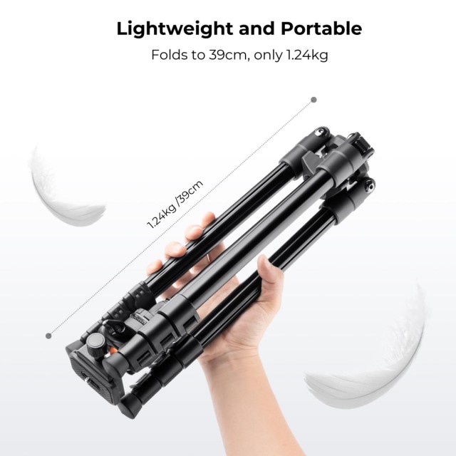 Kompaktní a přenosný stativ - ideální pro cestování, vlogování a práci. Kvalitní vojenská slitina hořčíku a hliníku, odolná proti korozi; stativ s kulovou hlavou váží pouze 2,56 lbs/1,16 kg, lze jej odklopit o 180° a složit na 390 mm/15,35", snadno se vejde do batohu nebo kufru při cestování.