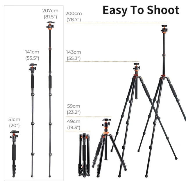 - * 【Praktično: Fleksibilno podešavanje od 59 cm do 200 cm】Noge s 4 dijela i 3 brza zatvarača omogućuju vam podešavanje radne visine od 59 cm do 200 cm u sekundama. Pobjednik u visini! Sklopljena veličina od 45 cm lako se nosi bilo gdje za fotografiranje na otvorenom.