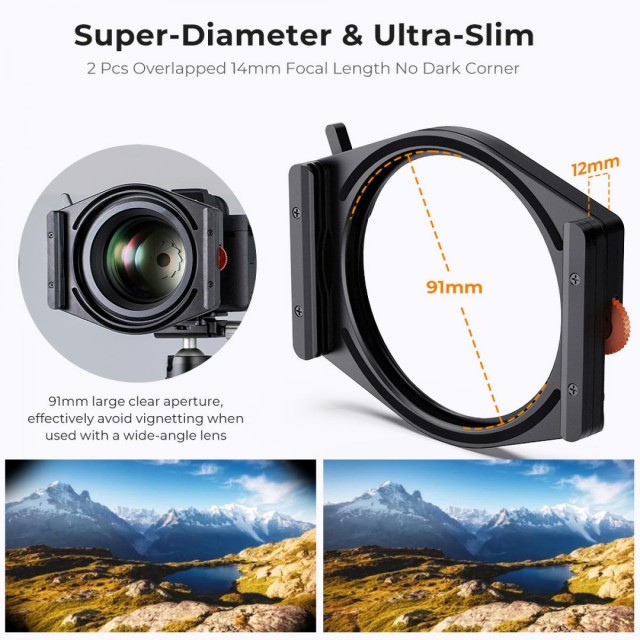 Jedinstveni kvadratni okvir filtra s 95 mm CPL, debljina držača 12 mm, lako se uzima, bez curenja svjetla. Učinkovito smanjite mogućnost vinjetiranja pri korištenju ultraširokokutnog objektiva. Iznimno tanak okvir i veliki promjer osiguravaju da nema vinjetiranja na širokokutnom objektivu i stražnji CPL dizajn za praktičnu ugradnju i uklanjanje.