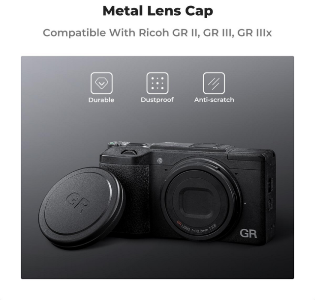Metalni poklopac za objektiv K&F za Ricoh GR II, GR III i GR IIIx pruža potpunu zaštitu za vaš objektiv s vanjskom površinom od aluminijske legure, unutrašnjosti od EVA materijala, te uključuje držač poklopca za objektiv i krpe za čišćenje od mikrovlakana.