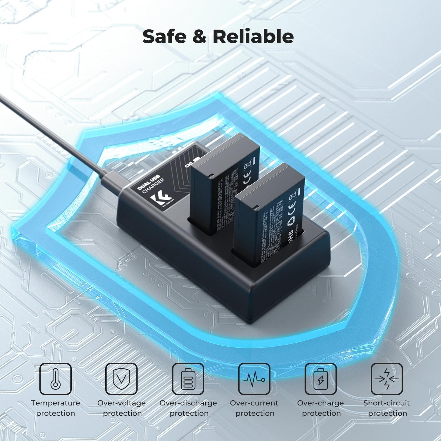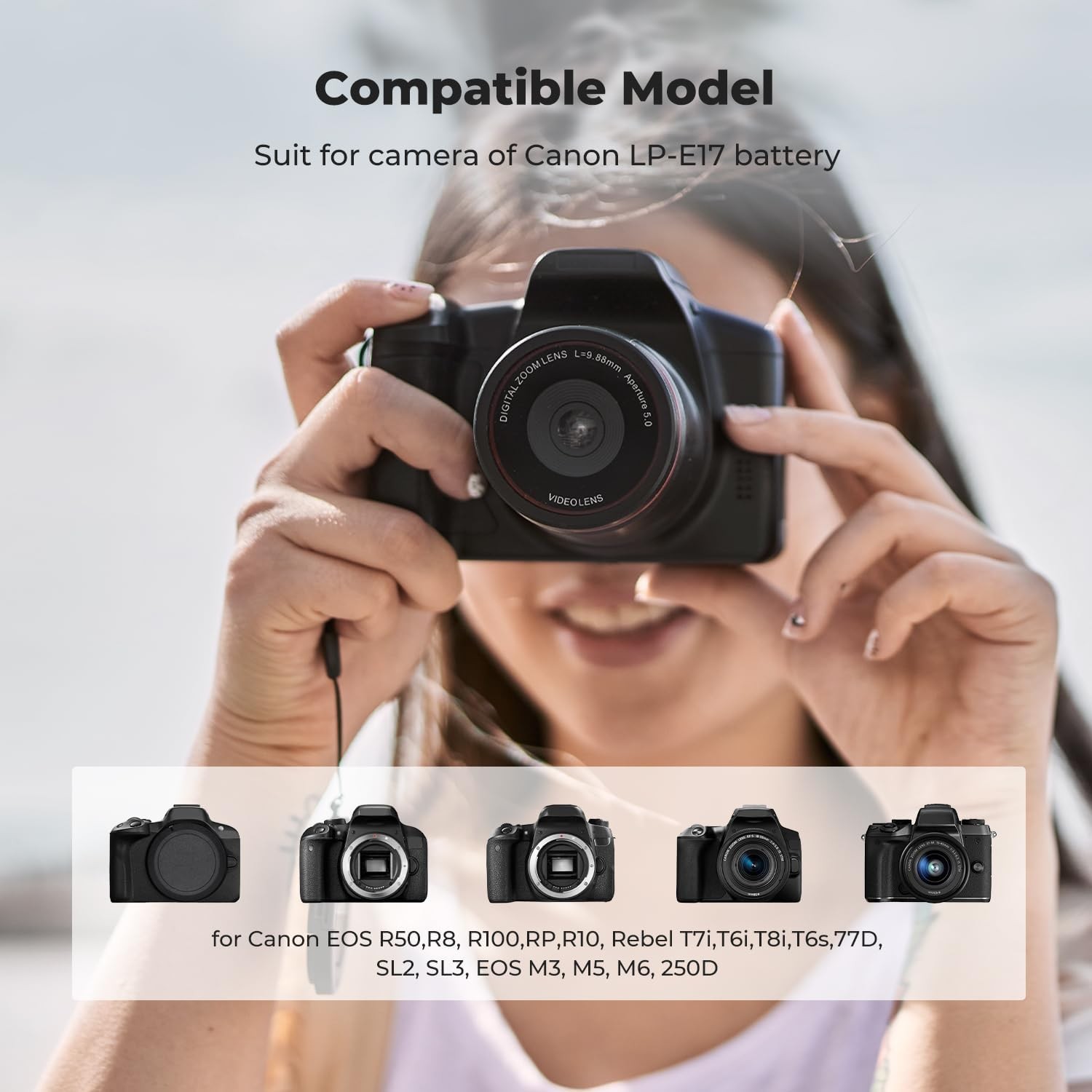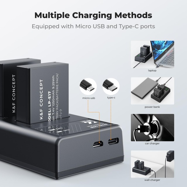 Produžite vrijeme snimanja svojim Canon fotoaparatom uz K&F Concept LP-E17 1250mAh bateriju i punjač s dva utora . Ovaj tanki, kompaktni komplet uključuje dvije visokoučinkovite baterije i dvokanalni USB-C/Micro B punjač, što omogućuje istovremeno ili odvojeno punjenje za učinkovit tijek rada i dugotrajne performanse.