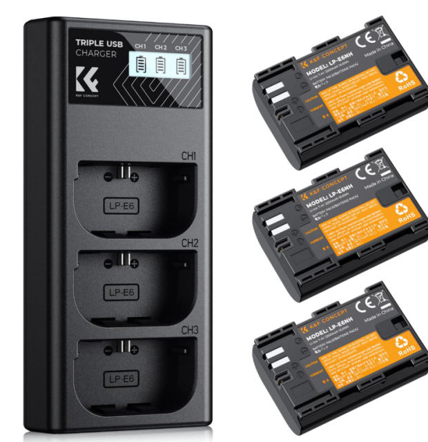 Set baterije LP-E6/LP-E6NH KF28.0039V1 i punjača s 3 utora svestrano je rješenje za napajanje dizajnirano za Canon fotoaparate kao što su Canon EOS R5, Canon EOS R6 i druge modele kompatibilne s LP-E6. Uključuje tri visokokapacitetne baterije od 2250 mAh i pametni punjač s 3 utora s LCD zaslonom za učinkovito istovremeno punjenje.
