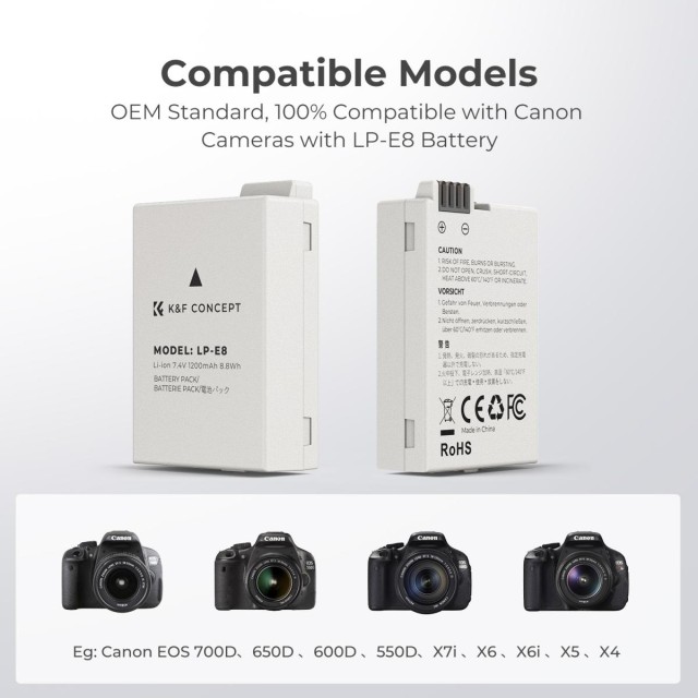 - * 【Standardna kompatibilnost】 Potpuno dekodiranje, kompatibilno s fotoaparatima koji koriste baterije modela LP-E8, podržava originalne punjače, kao što su Canon EOS 700D 650D 550D X7i X6i X5 i drugi fotoaparati