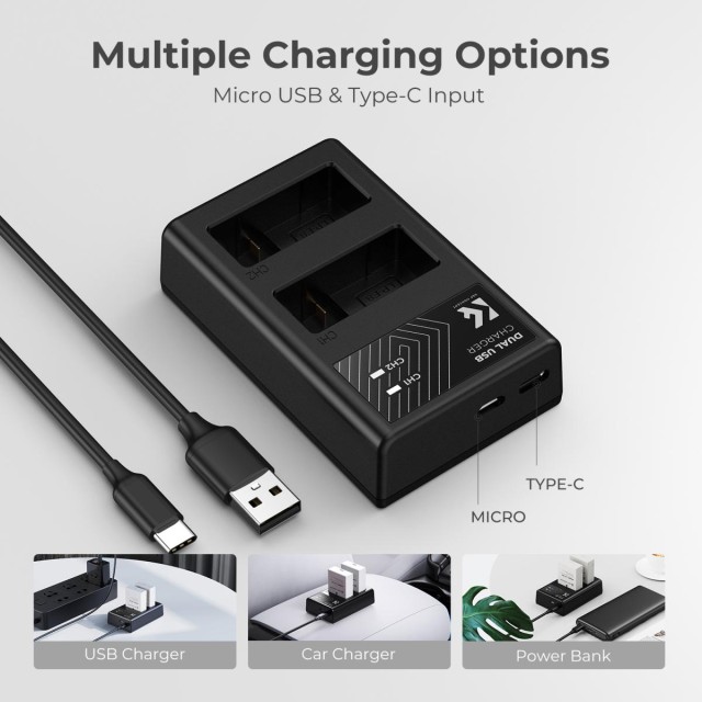 Dvije zamjenske baterije LP-E8 od 1200 mAh i punjač s dva utora pružaju više energije za snimanje fotoaparatom. Potpuno dekodiranje, kompatibilan s fotoaparatima koji koriste baterije modela LP-E8, podržava originalne punjače, kao što su Canon EOS 700D 650D 550D X7i X6i X5 i drugi fotoaparati. Punjač ima dva ulazna sučelja, Micro USB/Type C, i podržava različite mogućnosti punjenja: može se puniti putem mobilnog napajanja, mobilnog napajanja/baterije, USB punjača i auto punjača; pružajući vam razne mogućnosti punjenja Opcija kao standardni punjač.