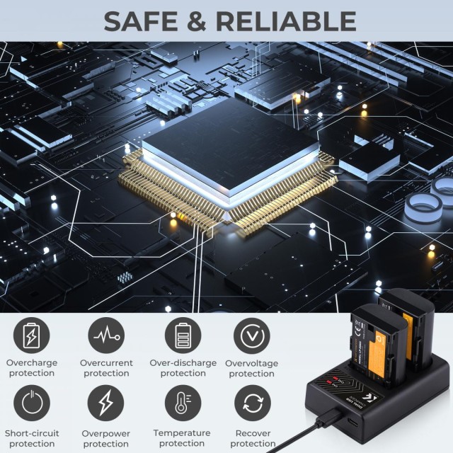 - * 【Sigurnosna inteligentna zaštita】 Dvostruki LCD punjač točno prikazuje status napunjenosti baterije, proces punjenja pomoću inteligentnih čipova bolje štiti bateriju od prekomjernog punjenja, visoke temperature, zaštite od prekomjerne struje, zaštite od prenapona, zaštite od kratkog spoja