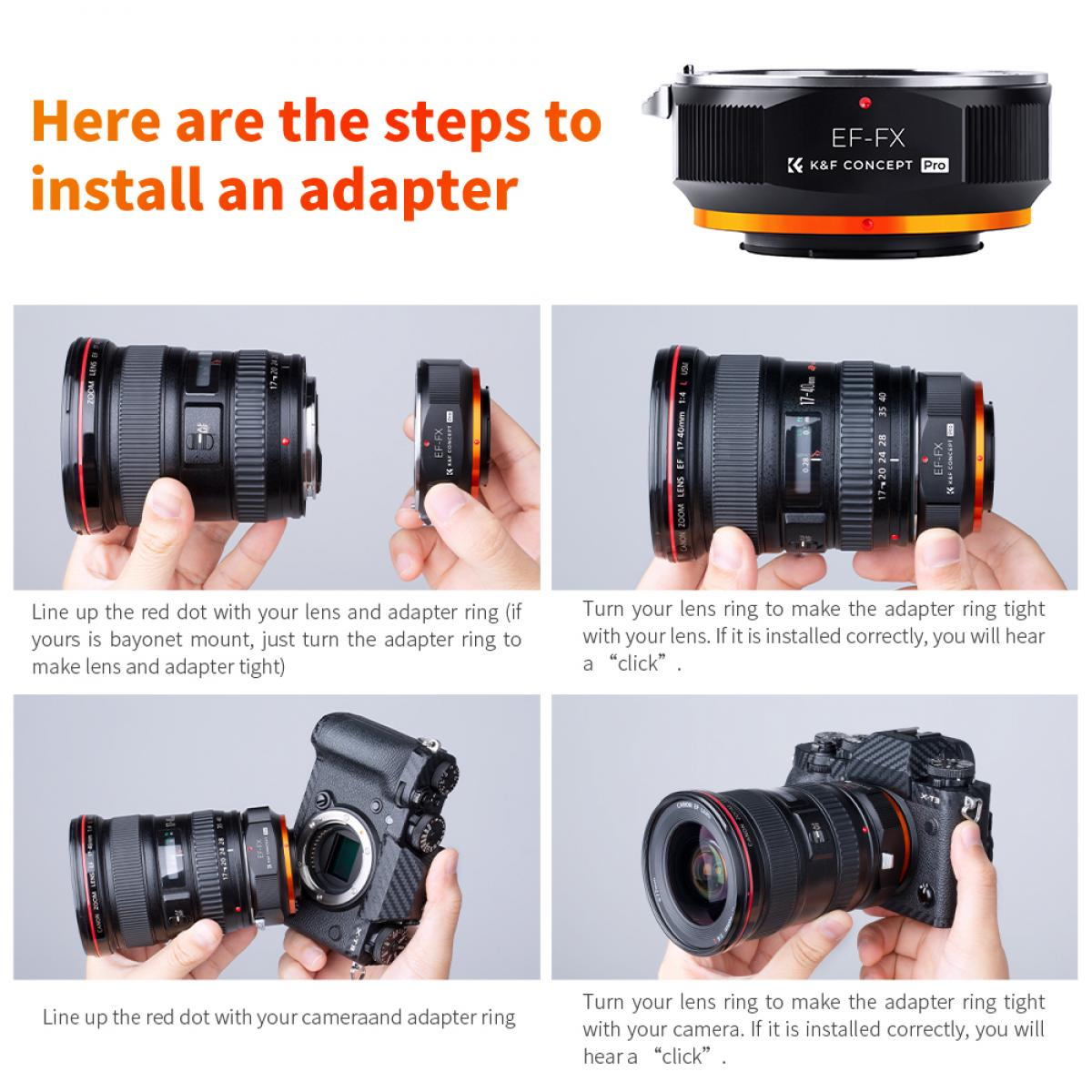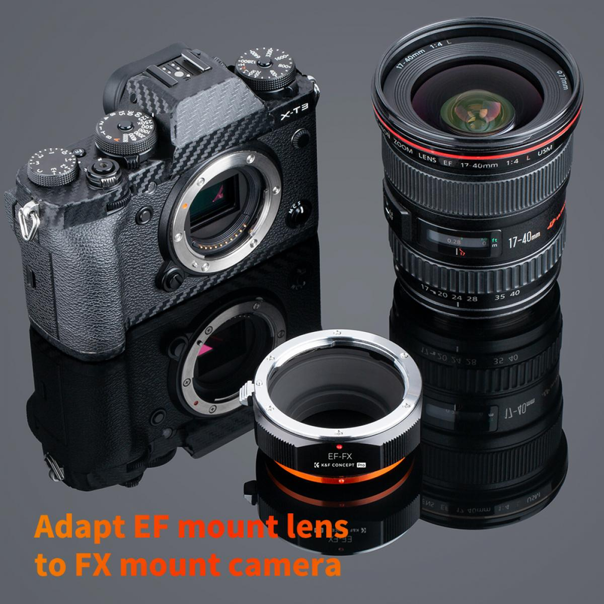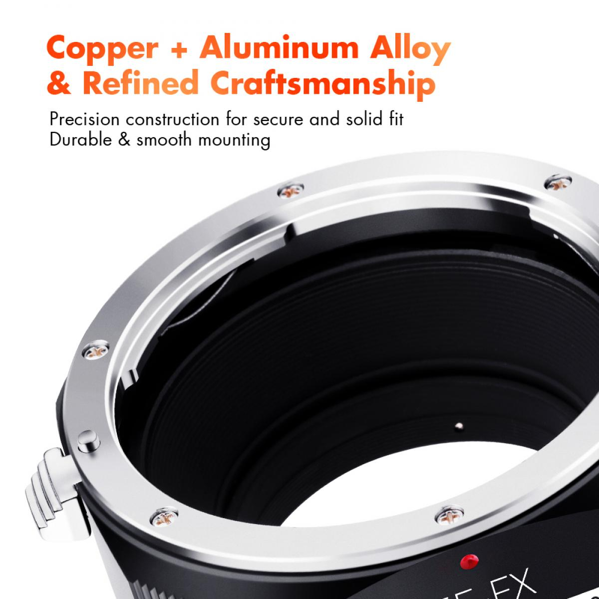 K&F Concept M12115 adapter za objektive novog dizajna visoke preciznosti omogućuje korištenje Canon EF i EF-S objektiva na tijelima fotoaparata bez zrcala s Fuji FX montažom, kao što su X-Pro1, X-T1 ili X-E2. Izrađen od čvrste metalne konstrukcije i završen kaljenim anodiziranim premazom, ovaj adapter je izdržljiv i otporan na habanje. Podržava ručno fokusiranje, ručno upravljanje otvorom blende i fokusiranje do beskonačnosti, dajući fotografima potpunu kreativnu kontrolu. Mat završna obrada unutrašnjosti pomaže u smanjenju unutarnjih refleksija, dok jasno označena crvena točka za poravnanje omogućuje brzo i jednostavno pričvršćivanje objektiva.