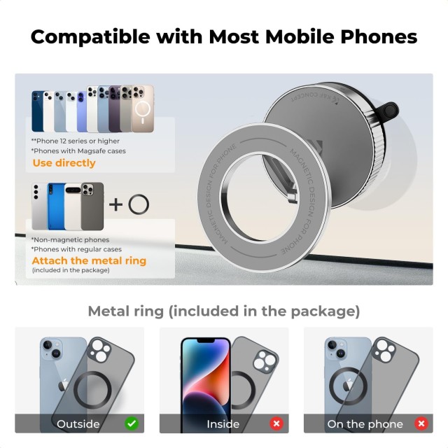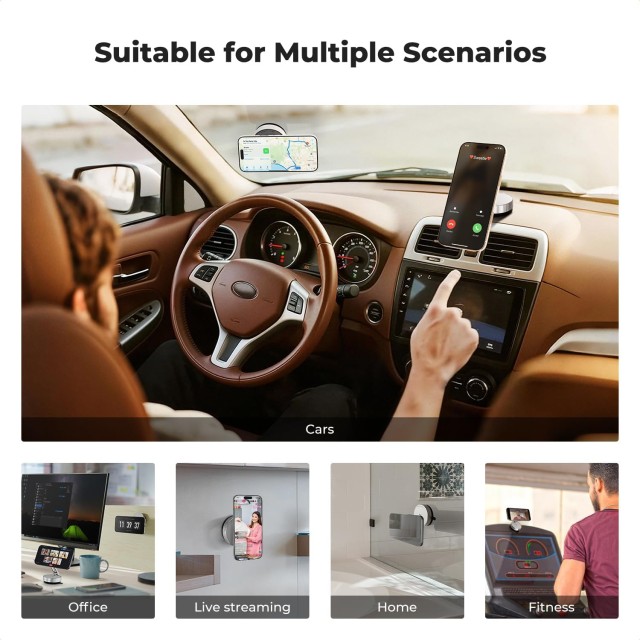 Težak samo 125 g i sklopiv na ⌀58 mm × 40 mm, nosač je izuzetno prenosiv i praktičan za putovanja. Dizajniran prvenstveno za MagSafe iPhone uređaje, može se montirati i na druge modele telefona putem priloženih metalnih prstenova koji se pričvršćuju na stražnju stranu uređaja za magnetsku montažu. Ova kombinacija sigurnosti, prilagodljivosti i prenosivosti čini ga savršenim za vožnju, streaming ili korištenje na stolu.