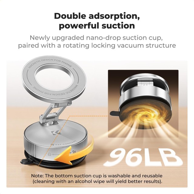 K&F CONCEPT magnetski držač za telefon za automobil (srebrni) je svestrani, vakuumski držač koji se može rotirati za 360° s jakim dvostrukim prstenastim N52 magnetima. Kompaktan, sklopiv i kompatibilan s MagSafe iPhoneima ili bilo kojim telefonom koji koristi priložene metalne prstenove, osigurava sigurno držanje na glatkim površinama i nadzornim pločama, a istovremeno nudi precizno podešavanje po više osi.