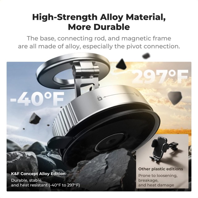 K&F CONCEPT magnetski držač za telefon za automobil (srebrni) kombinira snažan magnetizam, pouzdano usisavanje i mogućnost podešavanja po tri osi kako bi stvorio siguran i svestran držač za telefon za vožnju, posao ili kućnu upotrebu. Njegov dvostruki magnetski dizajn s 20 N52 magneta visoke čvrstoće pruža sigurno prianjanje na telefonima čak i tijekom neravne vožnje. Baza s vakuumskom čašicom ima dizajn s nano-gelom, što omogućuje ponovljeno pričvršćivanje i čišćenje bez gubitka prianjanja, te radi na ekstremnim temperaturama od -40°C do 148°C.