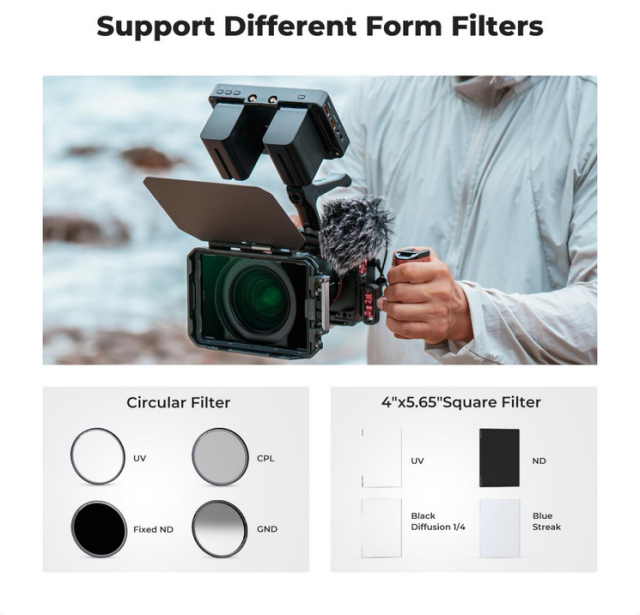 Svestrani sustav filtera: Mat kutija sadrži dva filtera debljine 4 mm (4x5,65"), sigurno zaključana na mjestu. To pruža fleksibilnost u različitim okruženjima snimanja, omogućujući vam korištenje ND filtera, polarizatora ili difuzijskih filtera po potrebi.