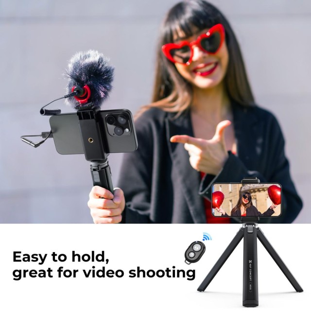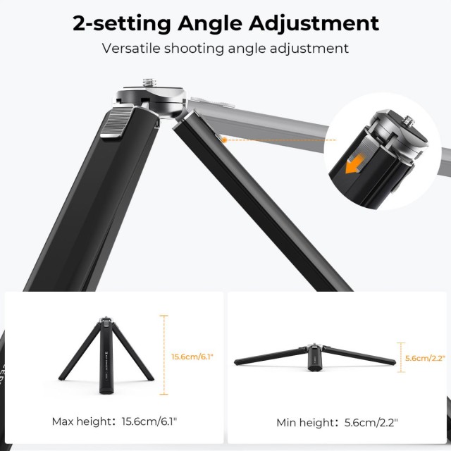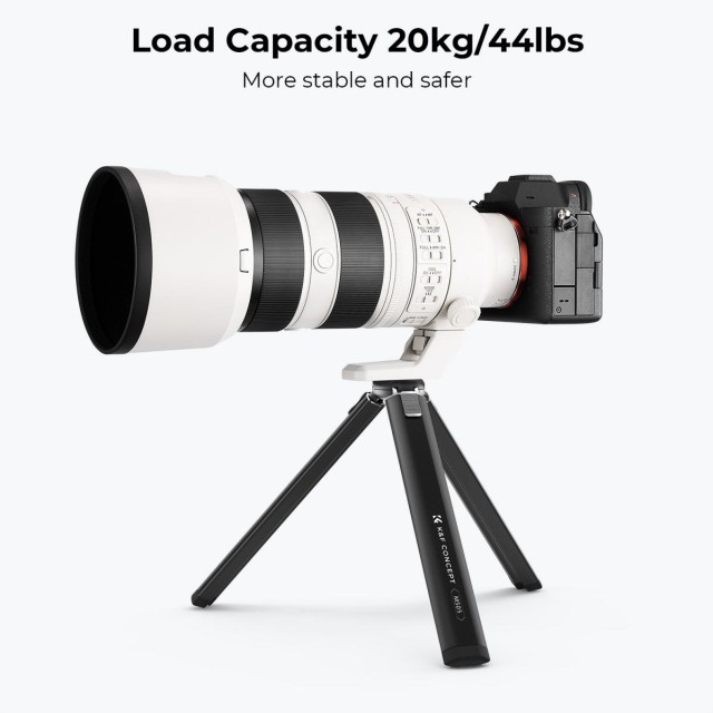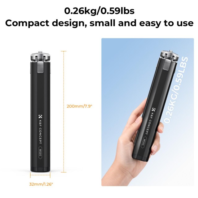K&F MS05 je lagani i izdržljivi metalni mini stativ za telefone i fotoaparate. Ima dvostupanjsko podešavanje visine , 1/4" vijčani priključak s robusnom nosivošću od 20 kg i protuklizni dizajn za stabilnu potporu tijekom bilo kojeg snimanja.