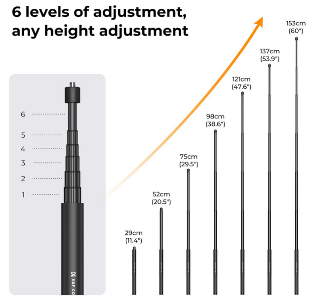 K&F MS07 svestrani je 60'' ekstra dugi produžni stup, idealan za lako snimanje panoramskih snimaka i udaljenih krupnih planova. Dizajniran za profesionalne fotografe i amatere, ovaj selfie štap osigurava da vaše područje snimanja više nije ograničeno. Njegova visokokvalitetna konstrukcija od aluminijske legure jamči izdržljivost, dok konektor od 1/4 inča u podnožju omogućuje jednostavnu montažu na postolje. Dizajn zatezne cijevi pruža čvrstu potporu i stabilnost, a silikonska ručka osigurava udobno držanje tijekom korištenja.