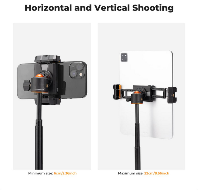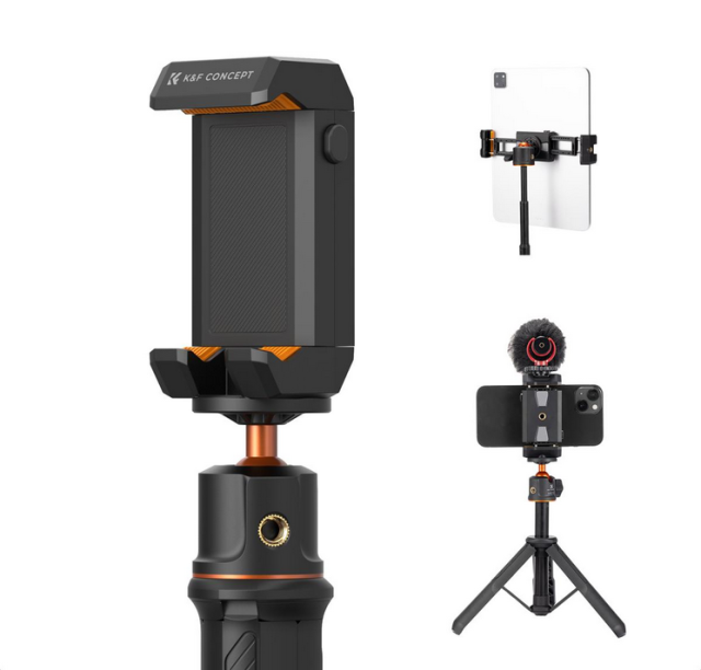 K&F MS20 svestrani je 2-u-1 držač za telefon i tablet dizajniran za praktičnost i fleksibilnost. Omogućuje vam sigurnu montažu mobilnog telefona i tableta istovremeno, što olakšava podešavanje postavki jednim klikom i povlačenjem. Držač ima hladno sučelje za pričvršćivanje raznih fotografskih dodataka, poput mikrofona i dopunskih svjetala. S podesivom širinom u rasponu od 6-22 cm i višestrukim 1/4" rupama za vijke za tronožac ili priključak opreme, pruža robusnu podršku i prilagodljivost. Kompaktan dizajn, lagana konstrukcija i šuplje dno osiguravaju jednostavno skladištenje, kompatibilnost punjenja i zaštitu uređaja.
