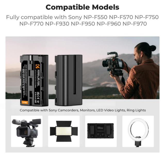 Široka kompatibilnost: Ove su baterije kompatibilne s nizom Sonyjevih kamkordera i uređaja koji koriste baterije NP-F550, F570, F750, F770, F930, F950, F960 i F970, što ih čini svestranim za različite postavke.