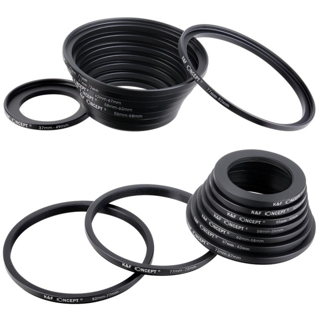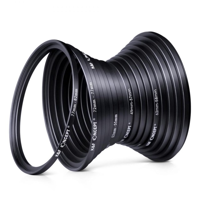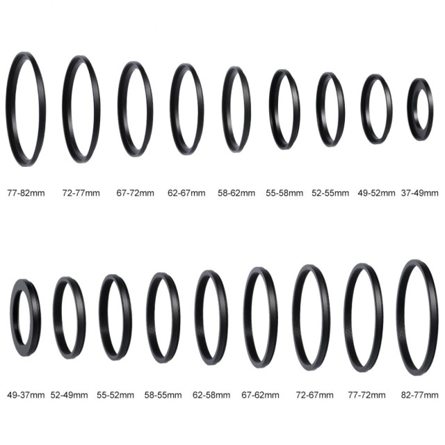 18 u 1 adapter prstena za filter objektiva u jednom setu. Uključuje set prstenastih adaptera za Step Up filtere (37-49, 49-52, 52-55, 55-58, 58-62, 62-67, 67-72, 72-77, 77-82 mm). Uključuje set prstenova za redukcijski filter (49-37, 52-49, 58-55, 55-52, 62-58, 67-62, 72-67, 77-72, 82-77 mm).