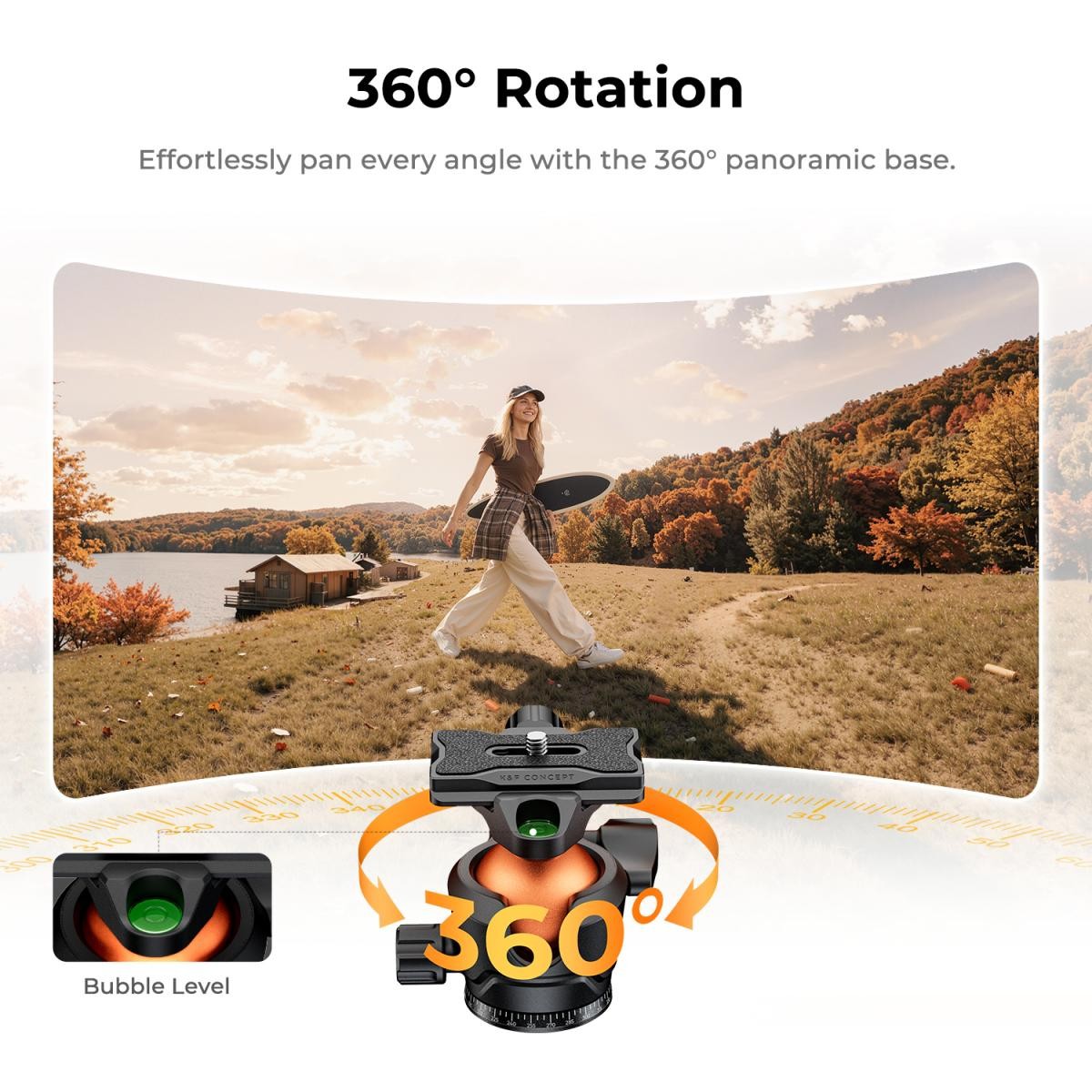 Glava s kuglicom od 40 mm kompatibilna s Arca-Swiss standardom može se slobodno rotirati, a panoramska baza od 360° omogućuje glatku i preciznu rotaciju. Glava s kuglicom može se nagnuti do 90° za okomito snimanje, dok rotirajući središnji stup omogućuje snimanje iz vrlo niskih kutova.