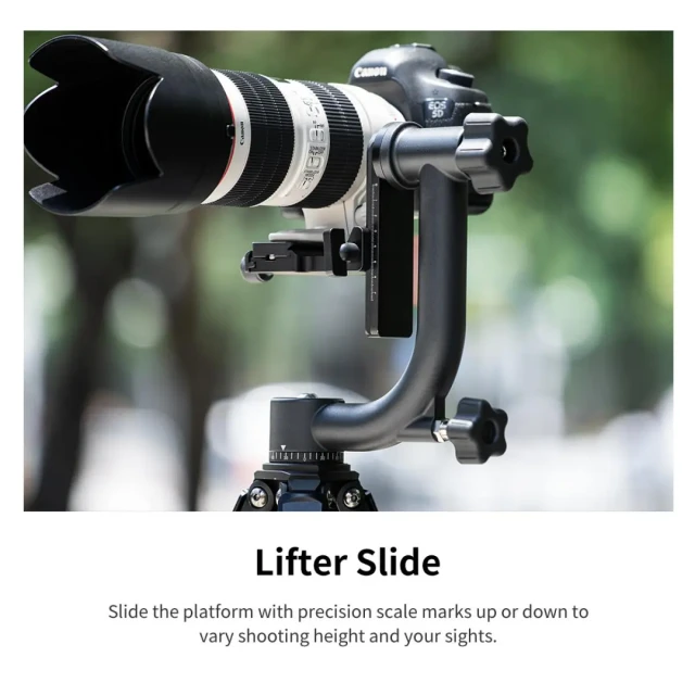· Precizno podešavanje: Veliki gumbi s libelama jednostavni su za korištenje, a numerirane skale duž okretne baze i okomitog kraka omogućuju vam jednostavno ponavljanje postavki za različite kombinacije objektiva i fotoaparata.