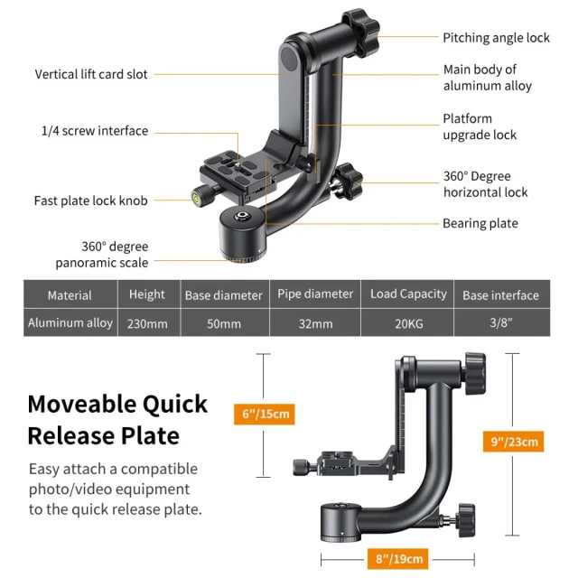 Materijal: Aluminijska legura. Nosivost: 20 kg. Visina: 23 cm. Širina: 19 cm. Standardno vitlo za kameru od 1/4 inča.