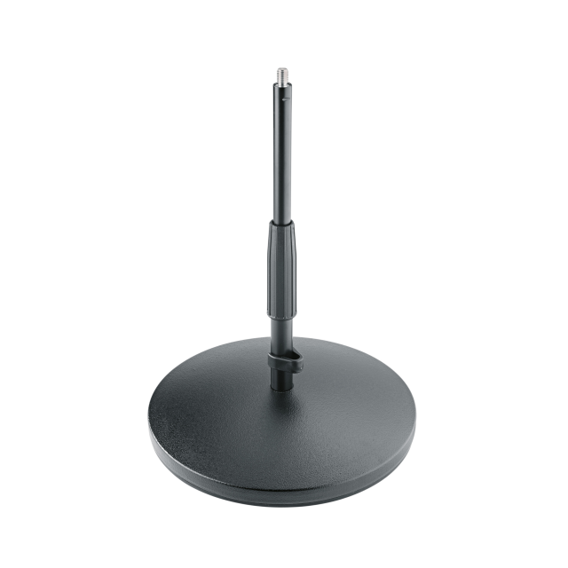 Nisko postolje s teškom bazom od lijevanog željeza za maksimalnu stabilnost. Okrugli gumeni prsten filtrira korake i smanjuje prijenos neželjenih zvukova. Elegantna podesiva spojka za jednostavno podešavanje visine.