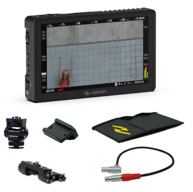 Kinefinity A912-001-01 KineMON 5U II kompletni monitorski paket je sveobuhvatno rješenje za nadzor kamera MAVO Edge 8K, MAVO LF i TERRA 4K, vidljivo na dnevnom svjetlu, koje uključuje ultra svijetli 5-inčni KineMON-5U II zaslon osjetljiv na dodir od 2000 nita, 12-inčni video/napajalni kabel pod pravim kutom, okretni nosač, adapter za hladni priključak, EVF klinasti blok i sklopivo sjenilo za trenutno postavljanje na kameru ili platformu u bilo kojim uvjetima osvjetljenja.
