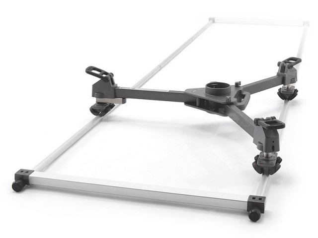 Baza uključuje do 12 gumiranih kotača (4 kotača po nozi) postavljenih pod kutom kako bi se osiguralo glatko i nježno kretanje po ravnoj stazi. Zahvaljujući podesivoj i kliznoj nozi, postolje šine nema problema čak ni u zavojima te osigurava glatko i nesmetano kretanje. Osim toga, gumirani kotači mogu apsorbirati čak i male čestice prljavštine i ne prenose njihov utjecaj na sliku.